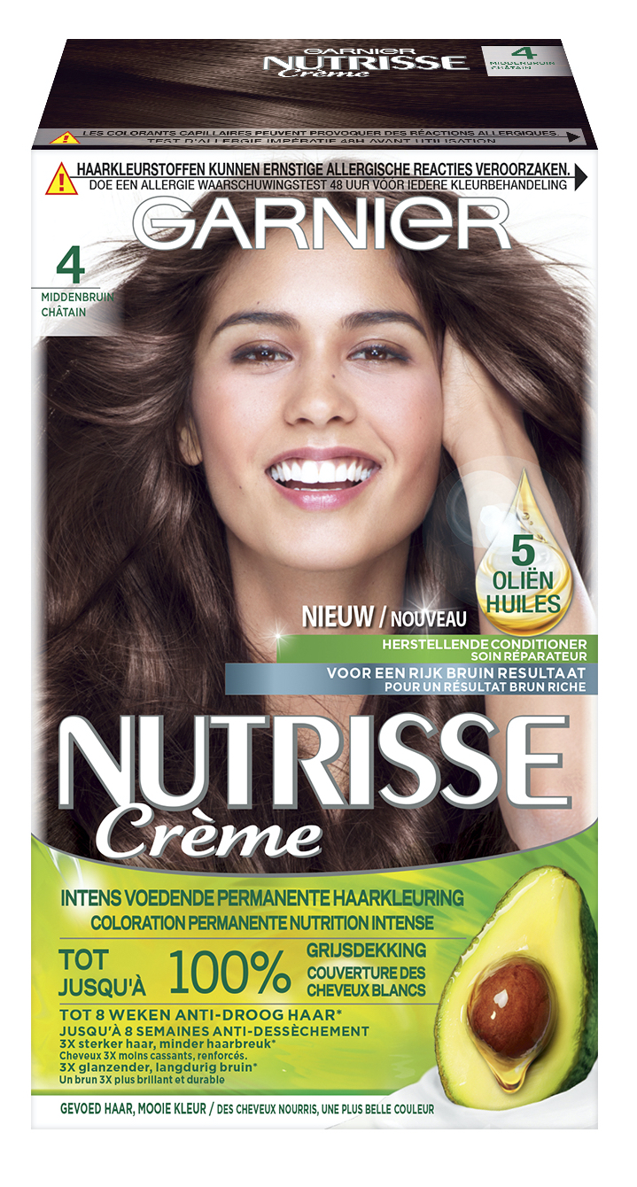 Garnier Crème Permanente Haarverf 4 Middenbruin betekent gevoed haar en daardoor een mooiere haarkleur.