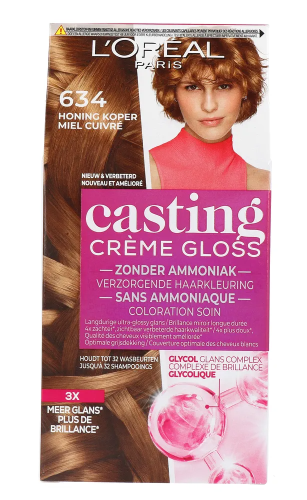L'Oréal Paris Casting Crème Gloss 634 Honey Biscuit (180ml) is een ammoniakvrije haarkleuring die zorgt voor een warme middenblonde haarkleur met gouden honingtonen en koperreflecties.