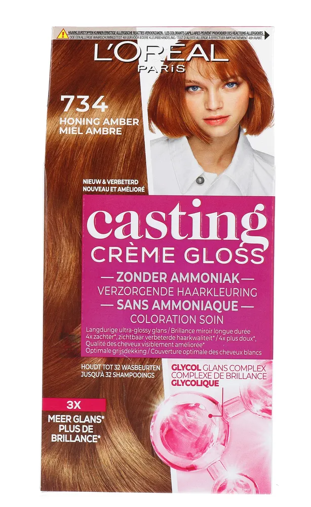L'Oréal Paris Casting Crème Gloss 734 Honey Crumble (180ml) is een ammoniakvrije haarkleuring die zorgt voor een warme middenblonde tint met gouden en amberkleurige reflecties.