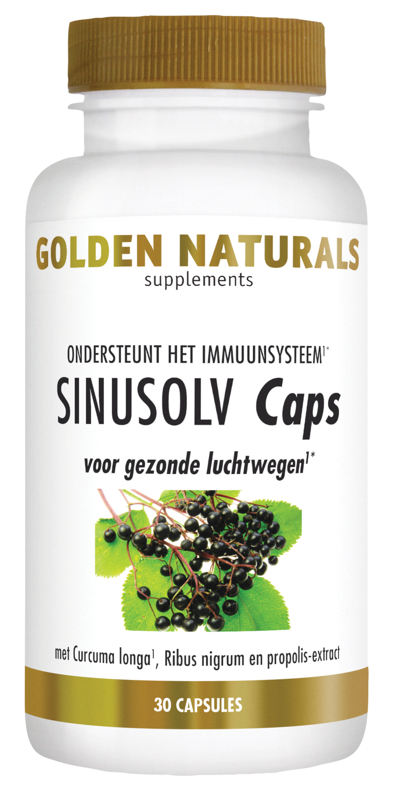 De Golden Naturals Sinusolv Capsules is een kruidenpreparaat met weegbree, geelwortel (Curcuma) en zwarte bes dat een verlichtende werking heeft op de bovenste luchtwegen, neus, neusslijmvliezen en bijholtes.