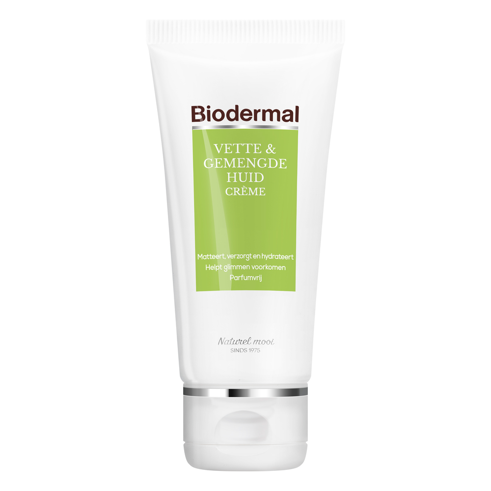 Biodermal Vette & Gemengde Huid Crème helpt het reguleren.