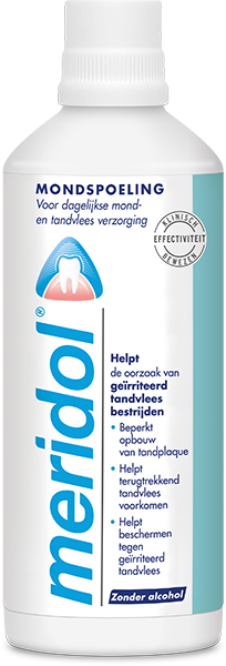 Meridol Mondspoeling helpt de oorzaak van geirriteerd tandvlees te bestrijden.