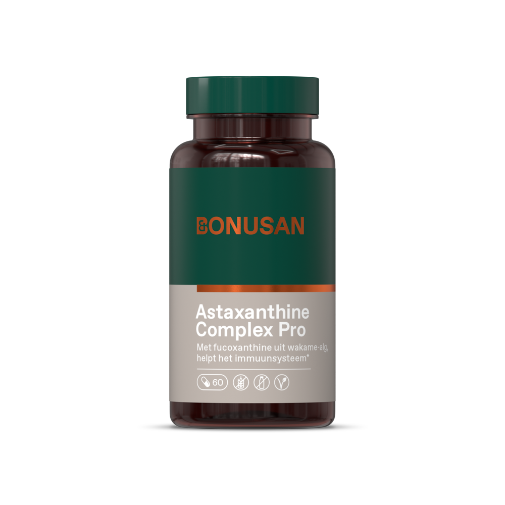 Astaxanthine en fucoxanthine zijn carotenoïden die voorkomen in voedingsbronnen zoals zalm, krill en bruine zeewieren zoals wakame. Bonusan Astaxanthine Complex Pro Capsules (60 stuks) is een uitgebalanceerde mix op basis van astaxanthine en fucoxanthine.