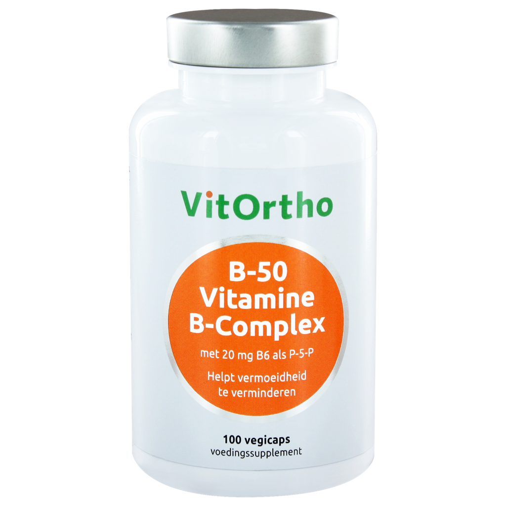 Vitamine B1, B2, B3, B5, B6, B12 en biotine bieden ondersteuning aan het energieniveau. VitOrtho B-50 Vitamine B-Complex bevat naast B vitaminen, choline, inositol en PABA.