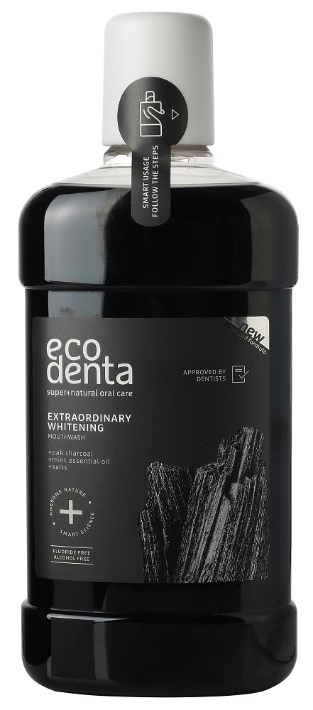 Het eikenhoutskool heeft anti-plak eigenschappen, net als de toegevoegde zouten en de natriumfluoride beschermt de tanden tegen gaatjes. Ecodenta Mondwater Whitening Extraordinary is een innovatieve mondwater met houtskool van de eikenboom.