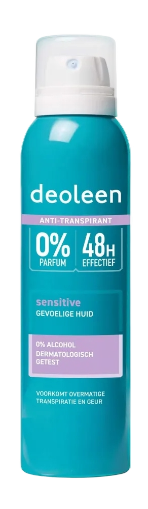 De extra milde formule is verrijkt met verzachtende oliën, zodat het bij uitstek geschikt is voor mensen met een gevoelige huid. Deoleen Anti-transpirant Deodorant Spray Sensitive is een alcohol- en parfumvrije anti-transpirant, die overmatig transpiratie voorkomt.