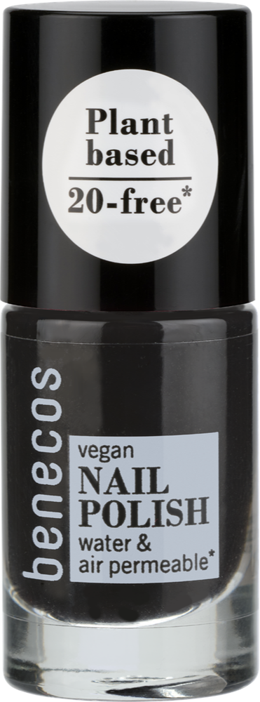 Benecos Nagellak Licorice (5ml) is een stijlvolle, diepe zwarttint met glanzende finish en een verzorgende, plantaardige formule.
