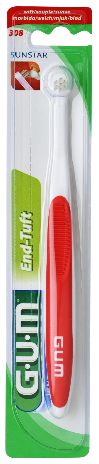 Het heeft een kleine borstelkop en nylonharen die dicht op elkaar zitten. GUM End-tuft Tandenborstel is speciaal ontwikkeld voor de reiniging van moeilijk bereikbare plaatsen zoals bij vaste beugels, implantaten, achter de achterste kiezen enz.