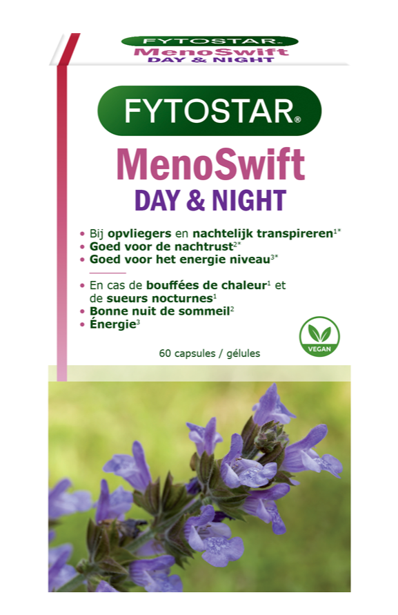 Zowel de dag- als nachtcapsule bevat Salie dat 's nachts helpt bij nachtelijk transpireren en overdag bij opvliegers. Fytostar MenoSwift Dag & Nacht is een 4-in-1 formule om overgangsverschijnselen zowel overdag als 's nachts aan te pakken.
