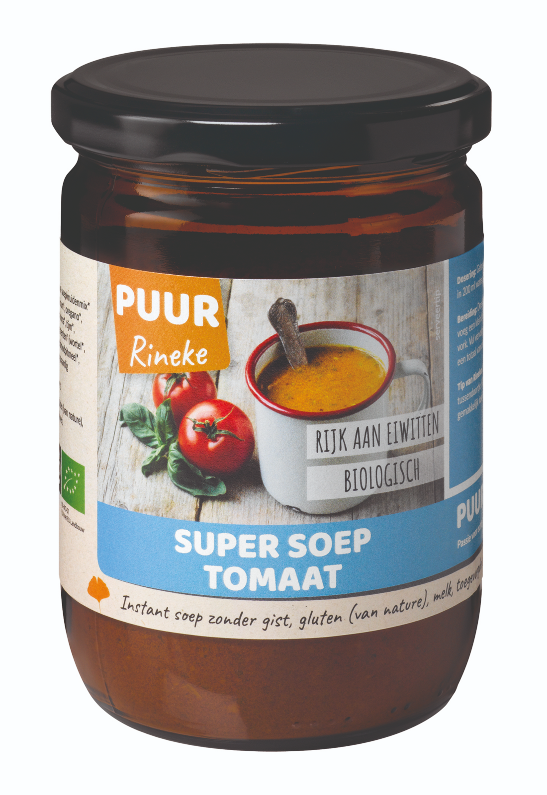 Puur Rineke Supersoep Tomaat is een (h)eerlijke biologische instant soep en rijk aan eiwitten voor extra energie.