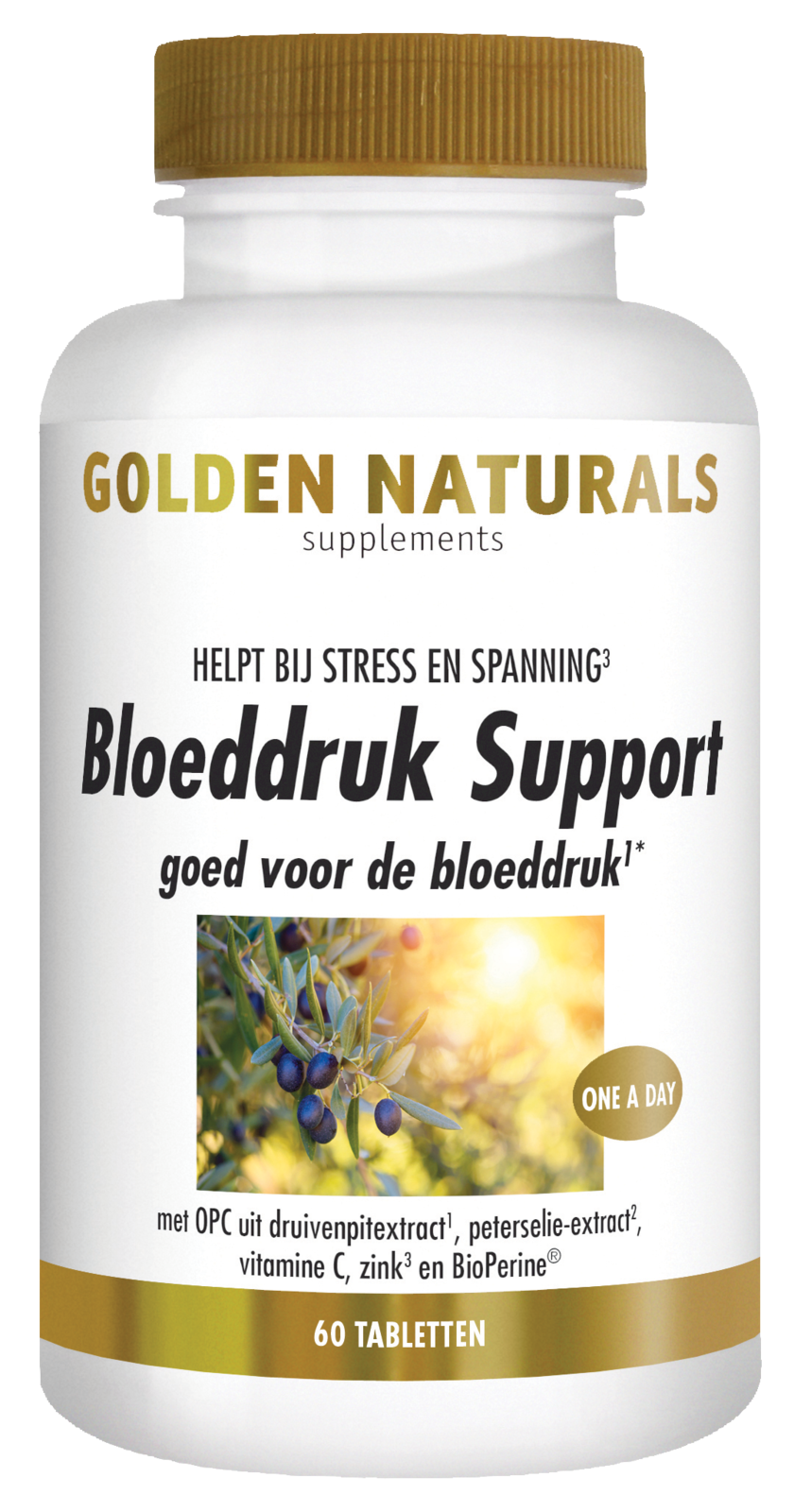 Het toegevoegde druivenpitextract (gestandaardiseerd op 95% OPC) is goed voor de bloeddruk. Golden Naturals Bloeddruk Support Tabletten dragen bij aan het behoud van een normale bloeddruk, naast een gezond eetpatroon en genoeg beweging.