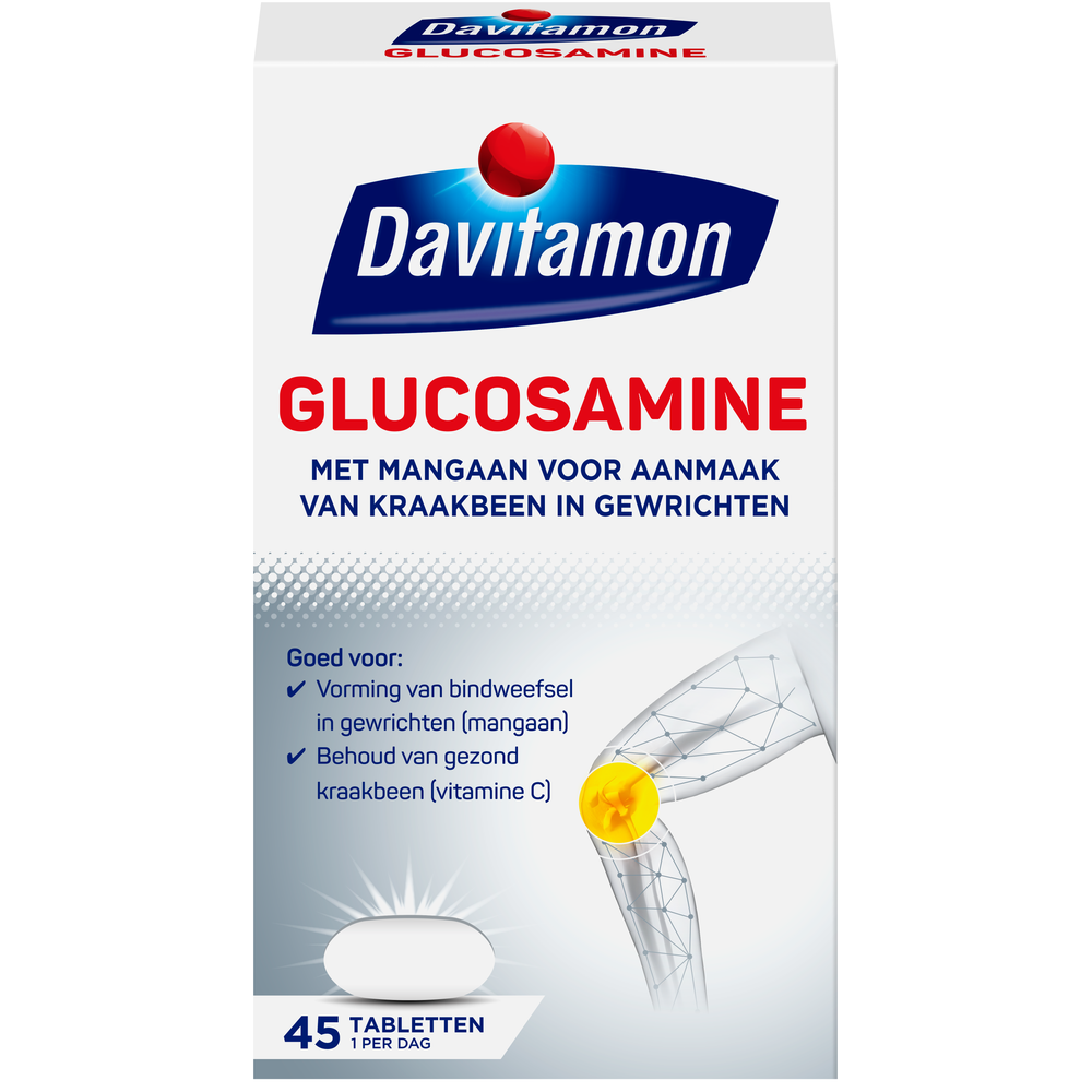 Vitamine C ondersteunt het behoud van gezond kraakbeen. Davitamon Glucosamine Tabletten bevat 1500 mg glucosaminesulfaat, evenals mangaan en vitamine C.