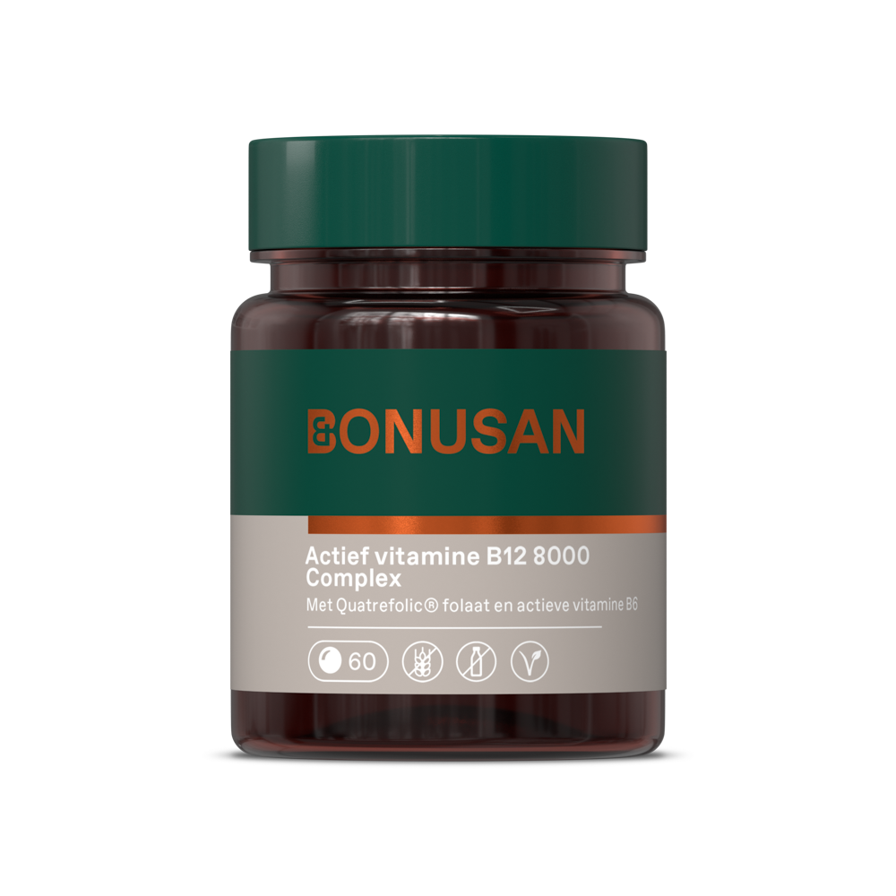 Bonusan Actief vitamine B12 8000 Complex (60 zuigtabletten) is een vitaminepreparaat in de vorm van een zuigtablet en bevat een complete samenstelling van twee actieve vormen van B12, de actieve vorm van B6 en actief Folaat in de gepatenteerde vorm met de hoogste biologische.