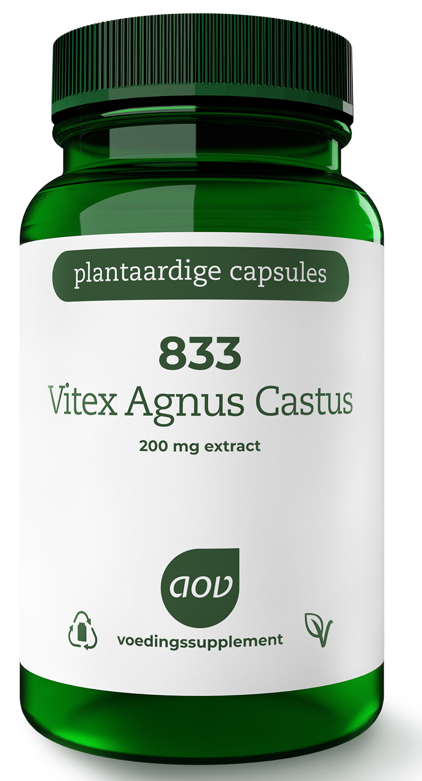 AOV 833 Vitex Agnus Castus Vegacaps (60 stuks) bevat per vegacap 200mg Monnikspeper (Vitex agnus castus)-extract gestandaardiseerd op 0.5% agnuside en 0.6y% aucubine.Het is geschikt voor vegetariërs en veganisten.Flacons van 100% gerecycled plastic (rPET).