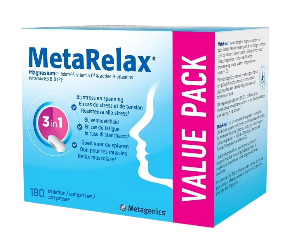 MetaRelax® is een compleet magnesiumcomplex te gebruiken bij de ondersteuning van de psychologische functie zoals bij stressmomenten (dankzij folaat), vermoeidheid (folaat, magnesium en vit B6) en ter ondersteuning van de spieren (magnesium en vitamine D).MetaRelax bevat de.