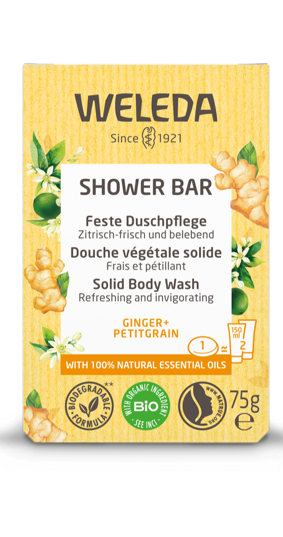 De formule bevat 100% natuurlijke essentiële oliën en geeft in combinatie met water een heerlijk romig en zacht schuim. Weleda Shower Bar Ginger + Petitgrain is een body wash verpakt in een stevig zeep bar.