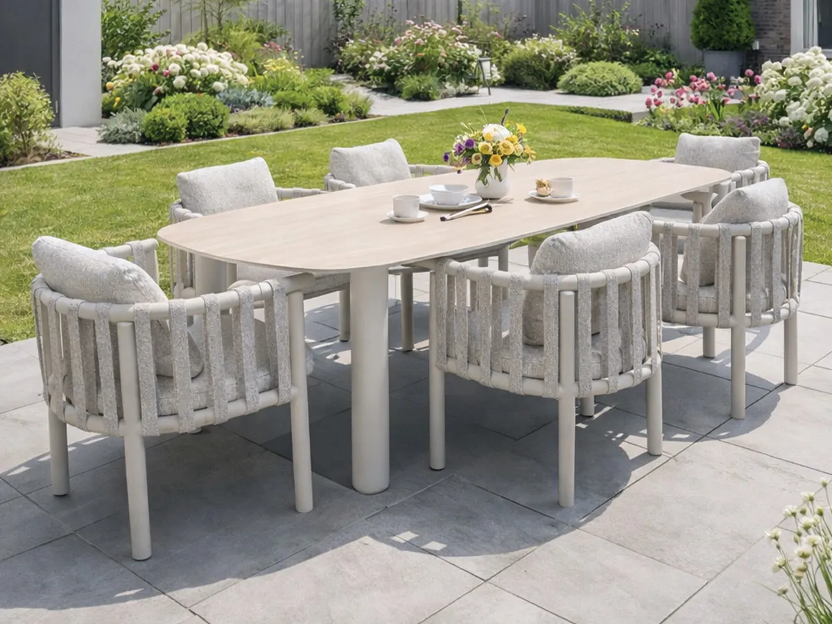 Het krasbestendige sintered stone tafelblad is onderhoudsvriendelijk en weerbestendig. Aan de ruime tafel van 240 x 110 cm geniet je zorgeloos van lange diners. Het lichtgewicht, gepoedercoat aluminium frame is stabiel en eenvoudig te verplaatsen, terwijl de verfijnde rope weaving warmte en karakter toevoegt. De royale zittingen met quick dry foam en luxe olefin bekleding bieden optimaal zitcomfort en drogen snel na een zomerse bui.