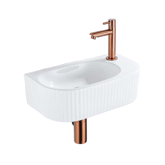 | Naam | Qeramiq Blend Fonteinset - 40X21.5X12cm - Rechts - Geribbeld - Halfrond - 1 Kraangat - Keramiek - Fonteinkraan Geborsteld Koper - Afvoerplug - Verlaagd Sifon - Wit Glans SW1209542/SW799405/SW799403/SW970033 |