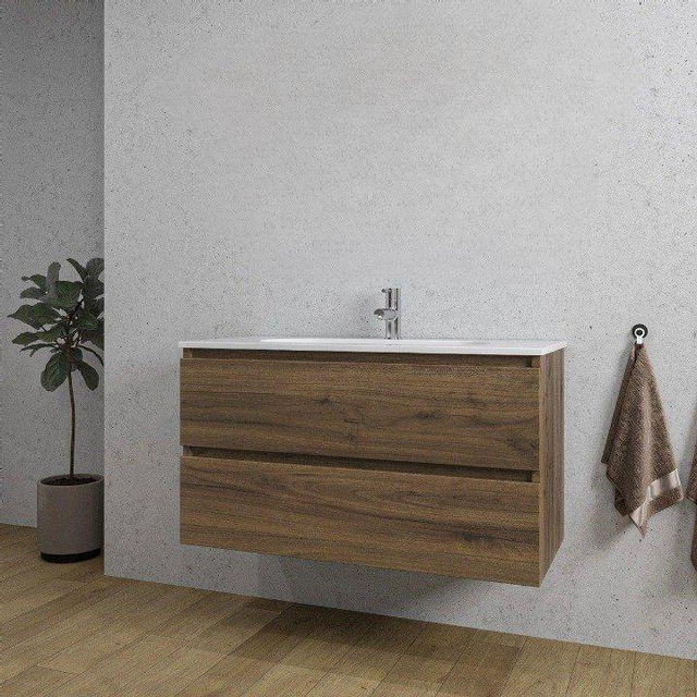 Saniclass Chaci Badkamermeubelset - 100x46x55cm - keramische wastafel wit - 1 wasbak - 1 kraangat - 2 lades - noten (hout) SW1212772/SW804532 kopen? Sanitairwinkel.nl is dé Saniclass specialist met een groot assortiment Badkamermeubelsets.