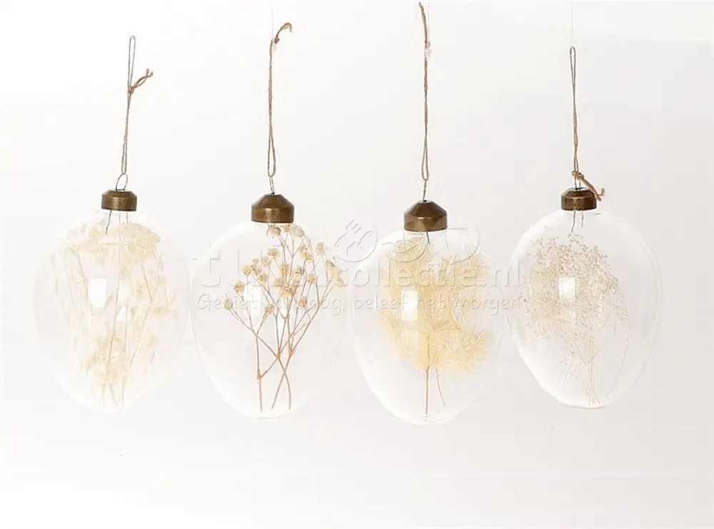 De paasdecoratie is gemaakt van transparant glas en voorzien van droogbloemen in lichte, natuurlijke tinten. Paasdecoratie Ei Droogbloem 6,5cm Assorti 1st