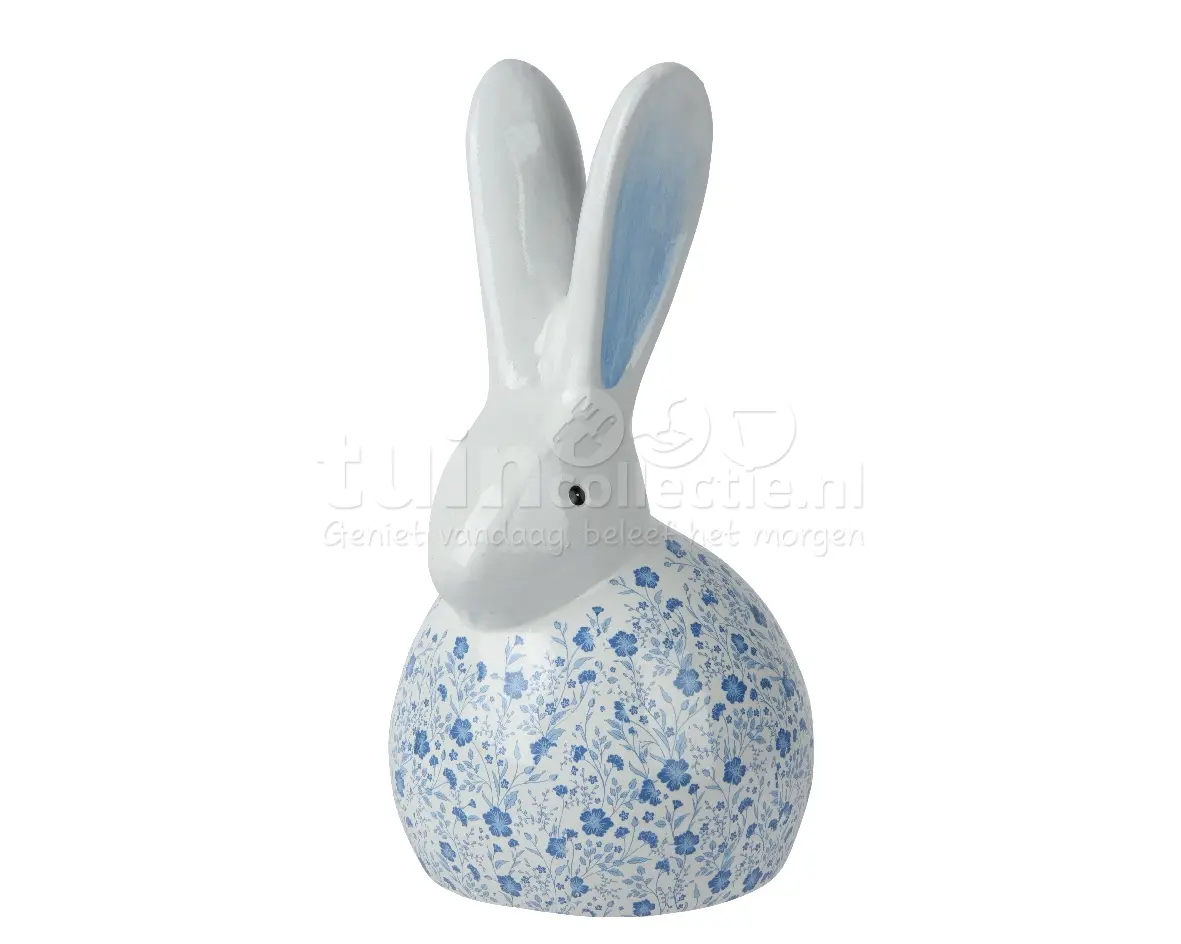 Dit konijnenbeeld is gemaakt van terracotta en afgewerkt met een glazuurlaag in wit en blauw. Paasdecoratie Konijn Blauw-Wit 27,5cm