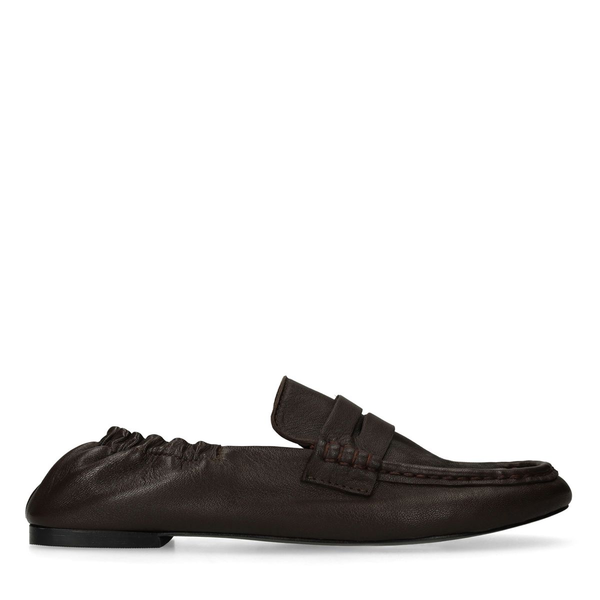 De instappers hebben een lage hak van 1 cm. Deze bruine leren loafers van Sacha hebben een elastisch rimpel design aan de achterkant.