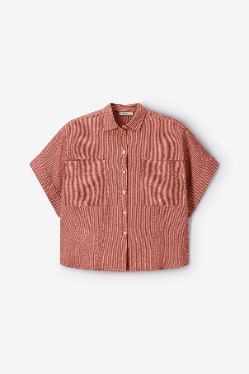 Verder heeft de blouse een roze kleur met twee opgestikte borstzakken aan de voorzijde. De blouse heeft korte wijde mouwen, een kraag, seersucker kwaliteit, een goudkleurige knoopsluiting en een wijde fit.