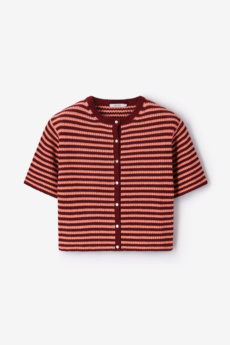 Verder heeft het vest een donkerrode kleur met all-over strepen en een gebreide kwaliteit stof. Het vest heeft korte mouwen, een ronde halslijn en een goudkleurige knoopsluiting.