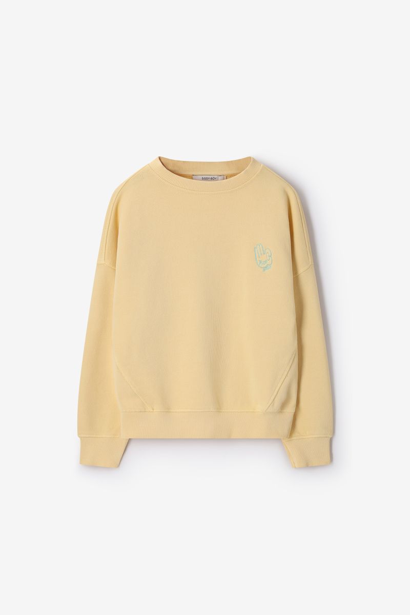 Verder heeft de sweater een lichtgele kleur met subtiele borduursel op de voorzijde. De sweater heeft lange mouwen, een ronde halslijn, ribboorden, verlaagde schouders en een relaxed fit.
