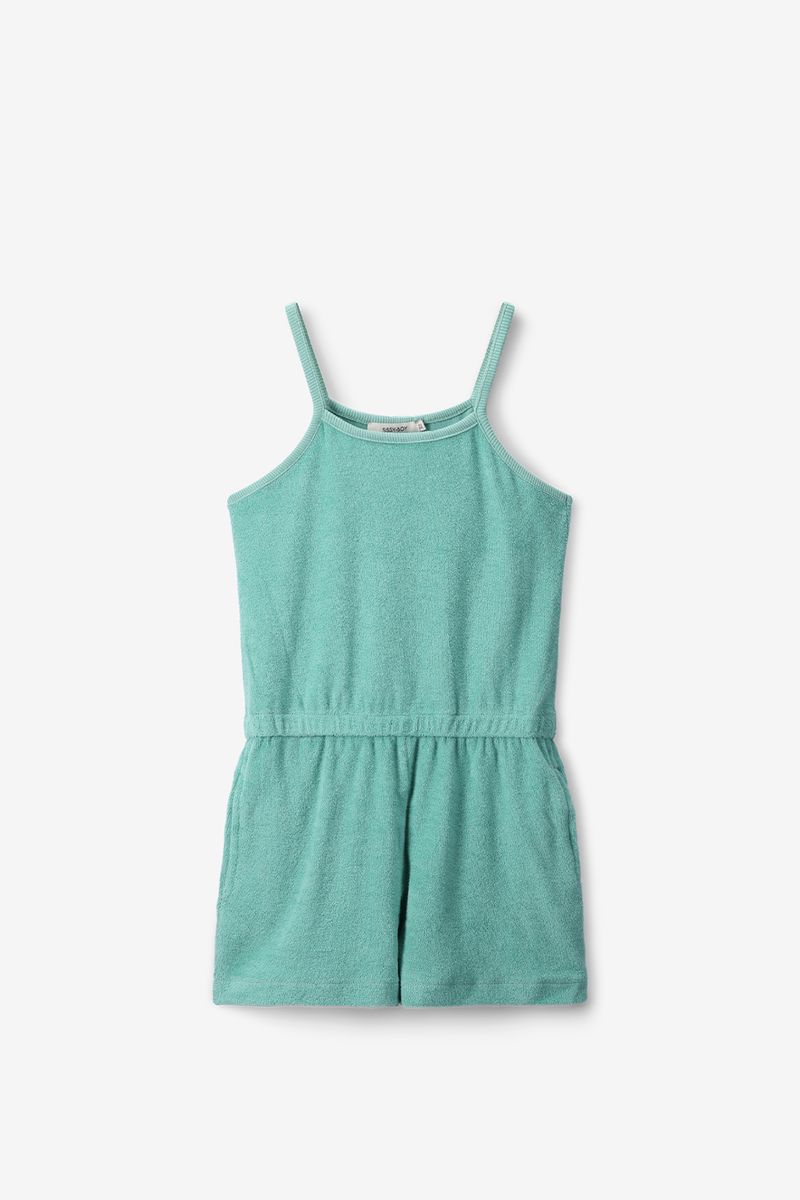 Verder heeft het een groene kleur en is het gemaakt van badstof. De playsuit heeft spaghettibandjes, een ronde hals en een elastische taille.