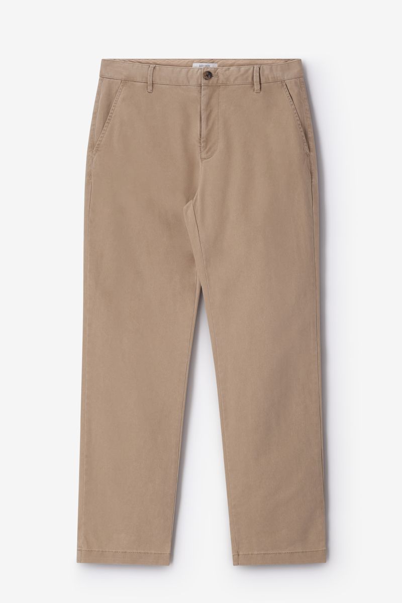 De chino heeft een middelhoge taille, een knoop- en ritssluiting, riemlussen, twee steekzakken aan de voorzijde en twee paspelzakken aan de achterzijde. Bruine mid-rise chino van Sissy-Boy.