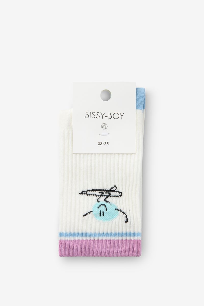 De sokken hebben een sportieve paarse rand aan de bovenzijde, ribkwaliteit en een smiley op een skateboard als detail. Blauwe sokken met smiley van Sissy-Boy.
