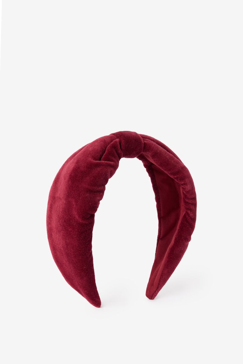 Verder heeft het een rode kleur. De haarband heeft een knoopdetail en is gemaakt van een velvet kwaliteit stof.