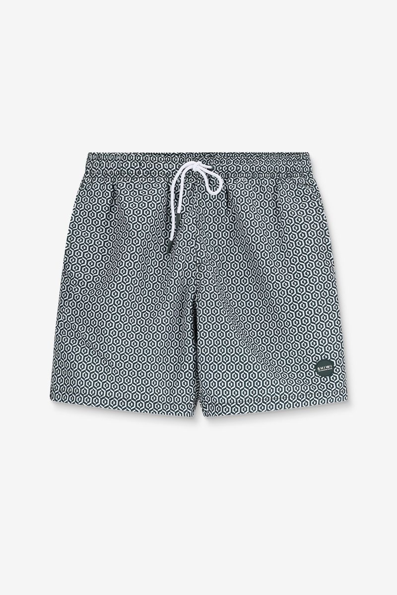 De zwembroek heeft een normale lengte, een binnenbroekje, een aantrekkoord in de waistband en steekzakken. Donkergroene zwembroek met geometrische print van het merk Shiwi.
