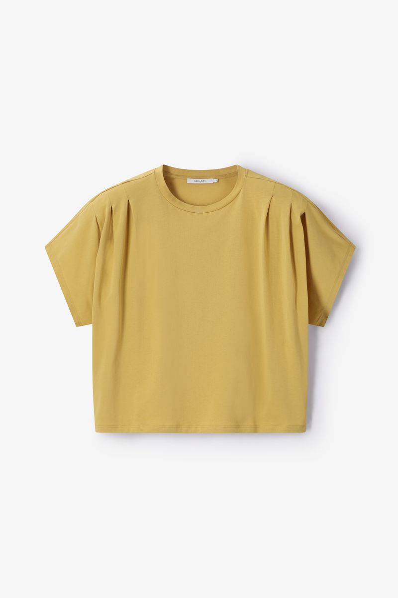 Het T-shirt heeft korte mouwen, een ronde halslijn, geplooide details op de schouders en een boxy fit. Geel T-shirt van Sissy-Boy.