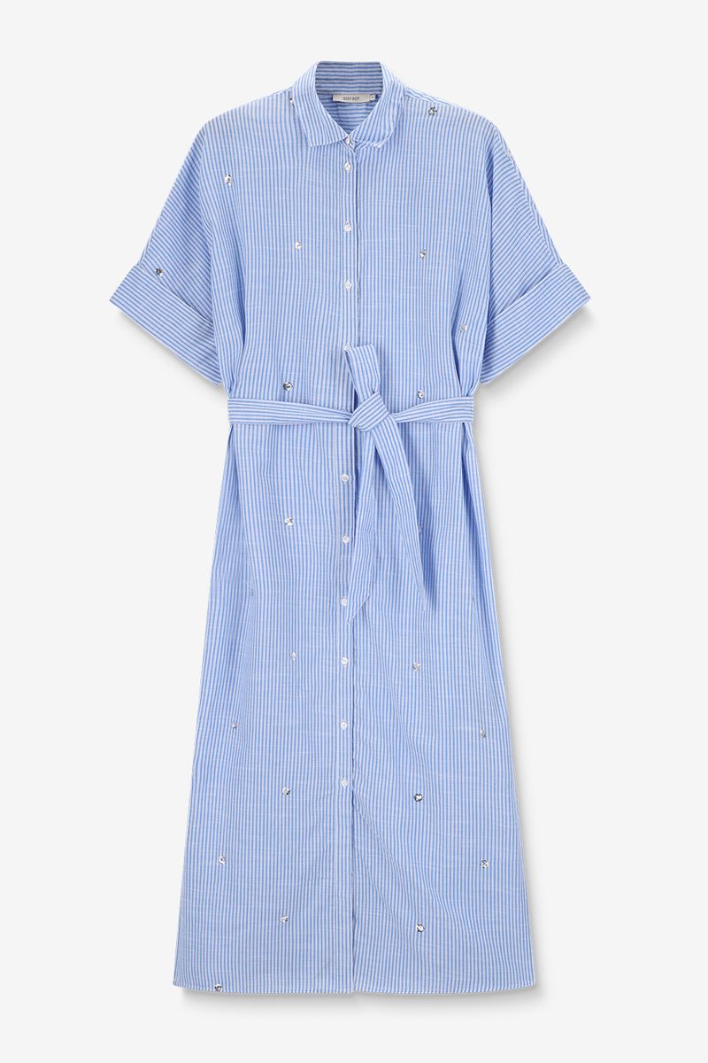 Deze jurk heeft een klassieke kraag, korte mouwen, een knoopsluiting en een maxi-lengte. Blauwe gestreepte jurk met paillettendetails van Sissy-Boy.