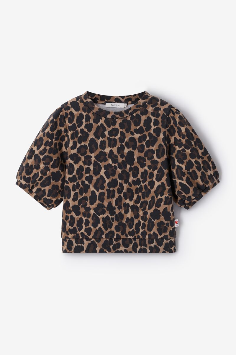 De sweater heeft korte pofmouwen, een ronde halslijn, regular fit en een all-over leopard print. Bruine sweater met leopard print van Sissy-Boy.