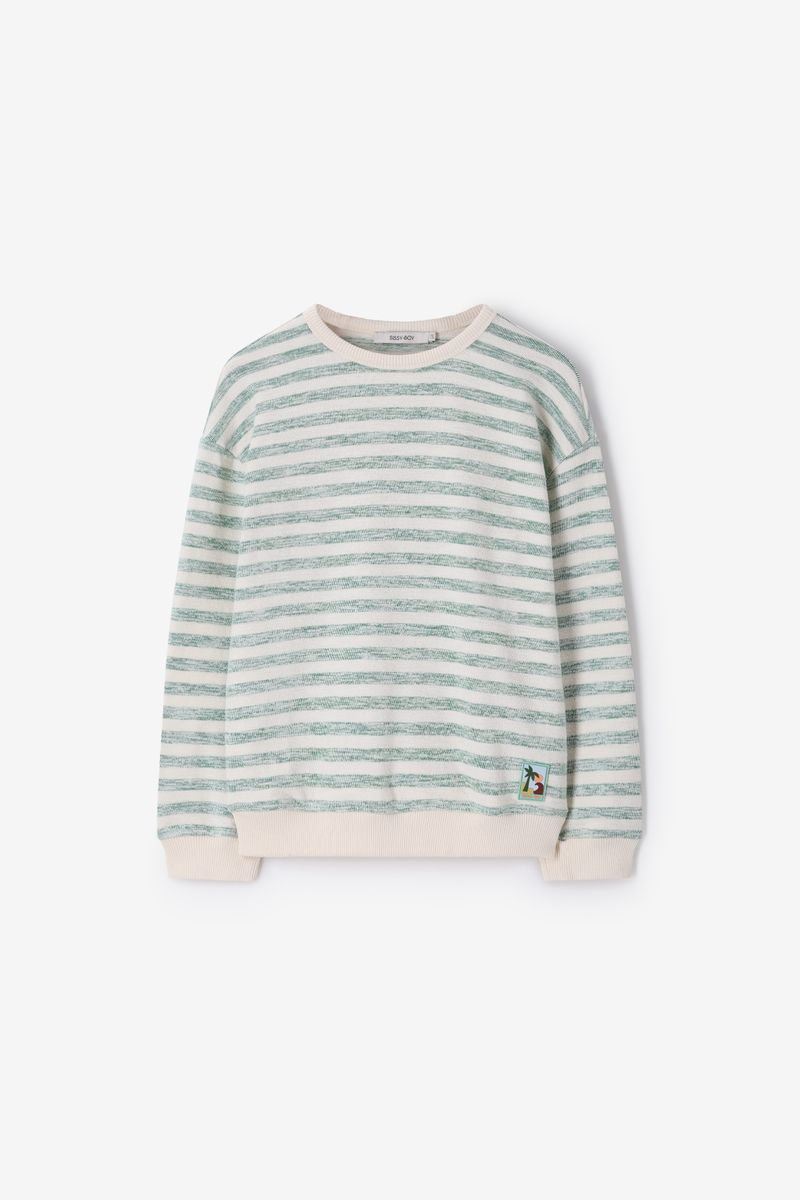 Verder heeft de sweater een witte kleur met all-over groene strepen en een subtiele palmboom badge aan de onderzijde. De sweater heeft lange mouwen, een ronde halslijn, ribboorden, verlaagde schouders en een relaxed fit.