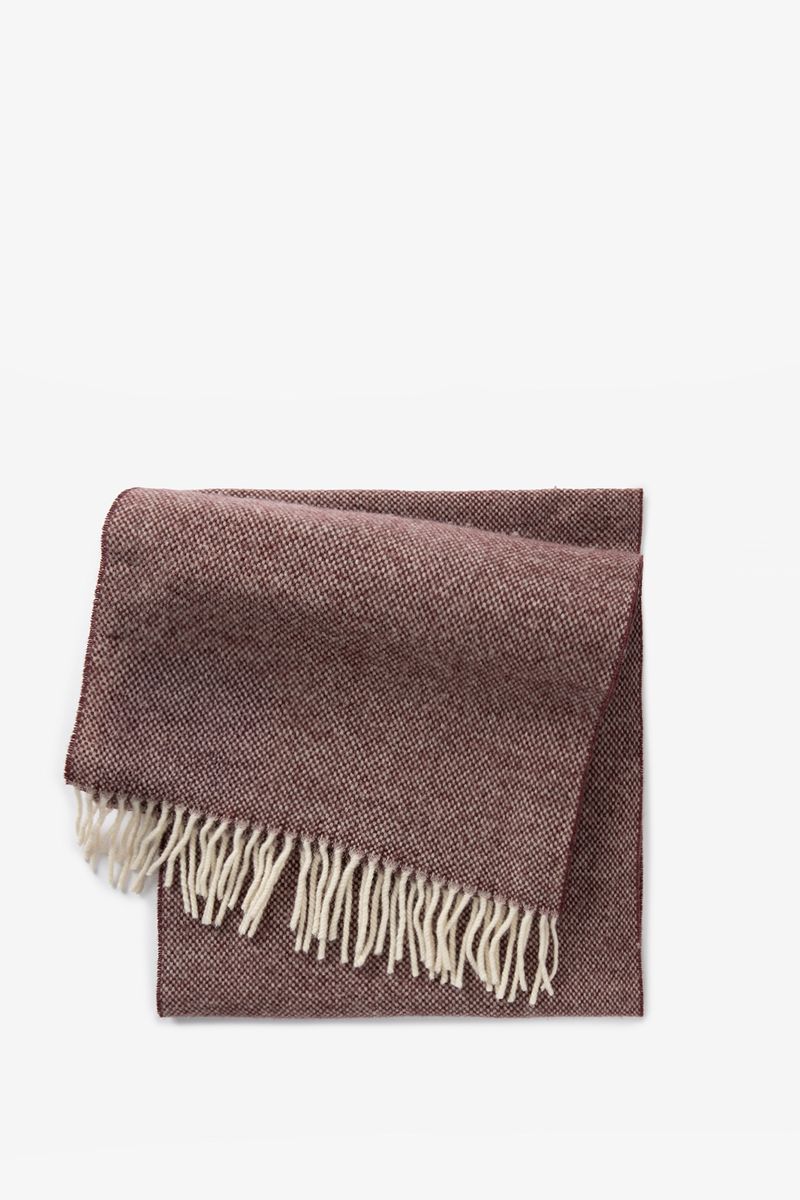 De sjaal heeft een donkerpaarse kleur, witte franjes en een paarse afwerking aan de zijkanten. Donkerpaarse wollen sjaal van Sissy-Boy.