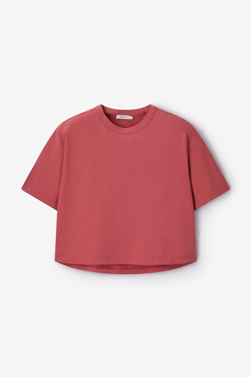 Het T-shirt heeft korte mouwen, een ronde halslijn, verlaagde schouders en een boxy fit. Donkerroze boxy T-shirt van Sissy-Boy.