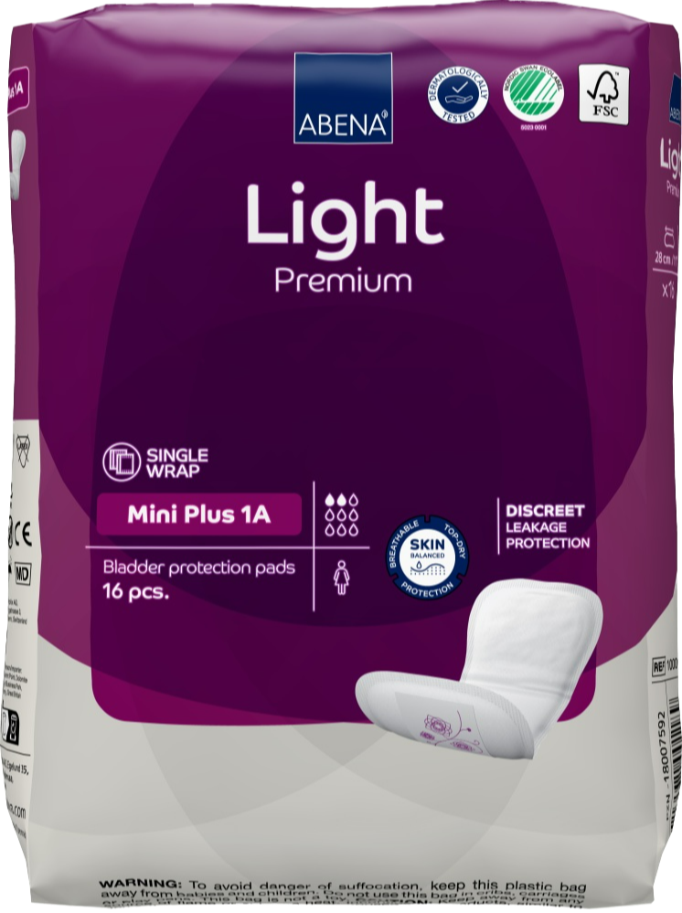 Superzacht en comfortabel. Abena Light Premium Mini Plus 1A Inlegverband is een inlegverband met dezelfde breedte als de Abena Light Mini 1, maar deze is iets langer en kan flinke druppels urine opvangen.