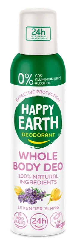 Deze unisex deodorant vormt een dun, onzichtbaar laagje dat bacteriën bestrijdt zonder de poriën af te sluiten of te verkleinen. Happy Earth Whole Body Deo Spray Lavender Ylang (100ml) is een 100% natuurlijke deodorant die gebruik maakt van natuurlijke minerale zouten.