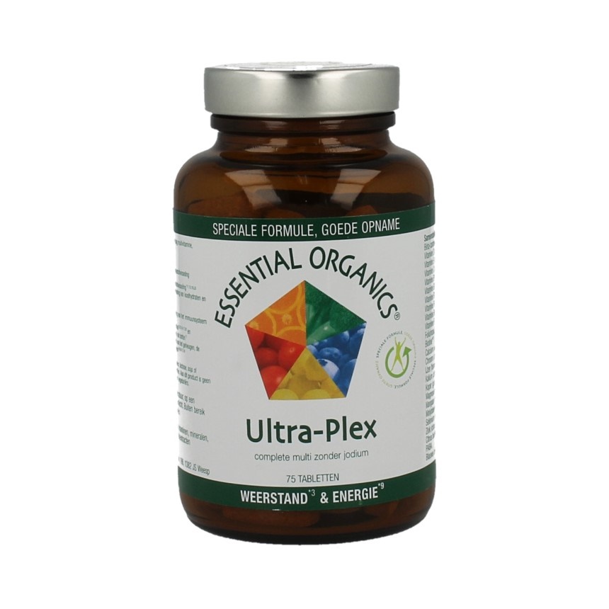Essential Organics Ultra-Plex is een multivitamine zonder jodium die uitermate geschikt is als aanvulling van de normale dagelijkse energie door vitamine D3, dat tevens bijdraagt aan het behoud van sterke botten en de opname van kalk verhoogt.
