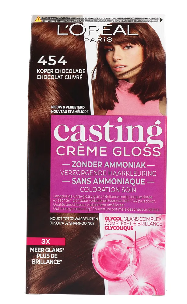 Deze verzorgende formule geeft uw haar tot wel 3x meer glans dankzij het speciale gloss-complex. L'Oréal Paris Casting Crème Gloss 454 Brownie (180 ml) is een ammoniakvrije haarkleuring die uw haar transformeert met een rijke bruine kleur en warme koperen reflecties.