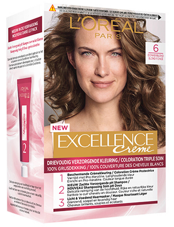 L'Oréal Paris Excellence 6 Donkerblond is een permanente haarkleuring die uw haar kleurt, voedt en verzorgt! Zowel uw kleur als uw hoofdhuid en haar krijgen alle aandacht in deze complete samenstelling van L'Oréal Paris.