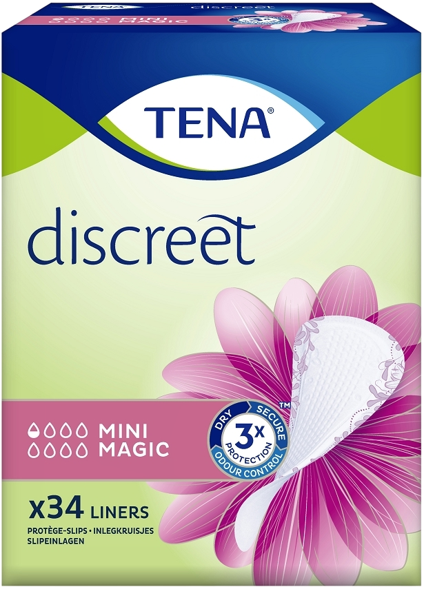 Deze kleine, zijdezachte en comfortabele inlegkruisjes absorberen veel beter dan reguliere inlegkruisjes. * Dit betreft een Hygiëne product, geen recht van retour TENA Discreet Mini Magic met drievoudige bescherming is speciaal ontworpen voor maximale discretie.