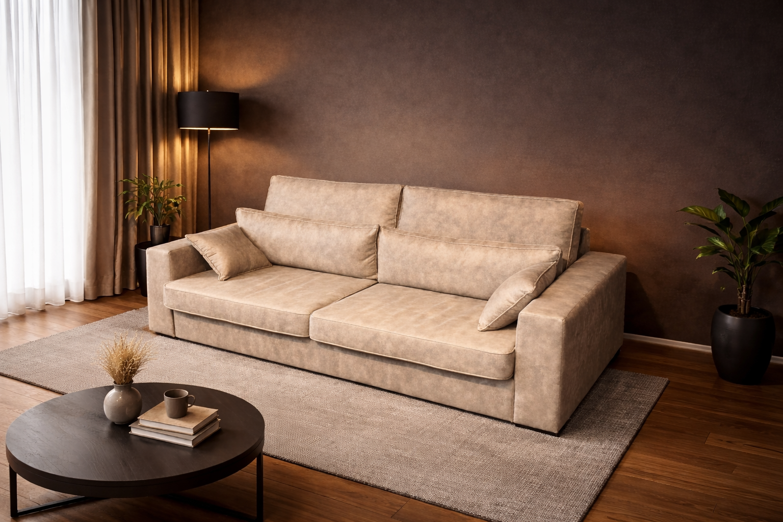 Moderne bank met brede zitvlakken en rustige uitstraling, geschikt voor een stijlvolle en evenwichtige woonkamer..