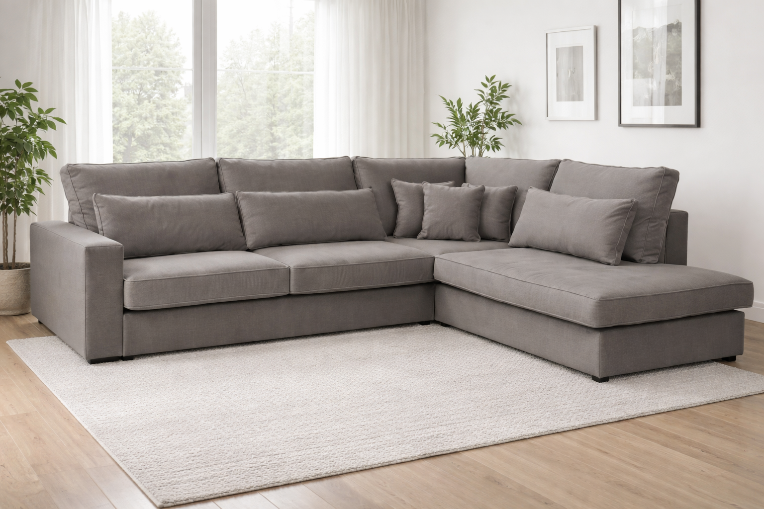 Comfortabele hoekbank met rustige uitstraling en tijdloos ontwerp, geschikt voor ontspannen zitten en een evenwichtige woonkamer..