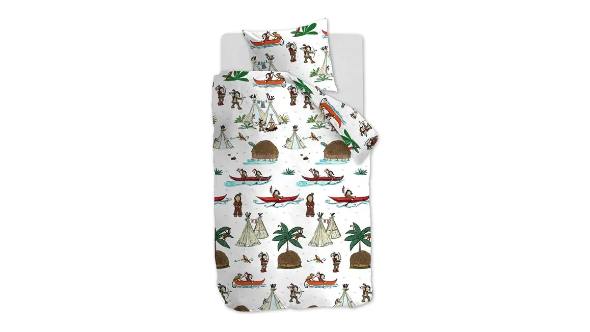 Zet je verentooi maar op en kruip onder het dekbedovertrek Wigwam van Beddinghouse Kids voor een prachtige droomreis naar Indianenland! Het witte overtrek is versierd met een grappige tekening van kleine indiaantjes met pijlen en bogen, tipi's en kajaks in een exotische wereld van palmbomen en papegaaien.