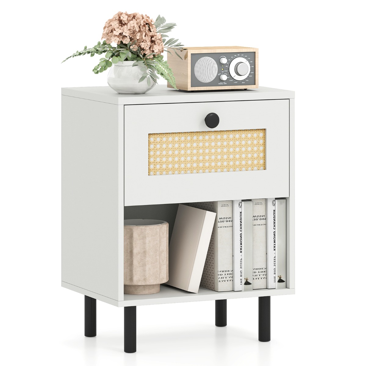 Kenmerken: Handgeweven rotan paneel voor een unieke bohemien stijl Groot oppervlak voor lamp, telefoon en wekker Diepe lade en open plank voor optimale opbergruimte Dikke panelen en metalen poten voor een hoge stevigheid Draagt in totaal tot 60 kg met versterkte stabiliteit 2 anti-kantelvoorzieningen inbegrepen voor extra veiligheid Lade met soepele metalen geleiders en elegante ronde knop Hoogte onder het meubel 12 cm vergemakkelijkt de dagelijkse schoonmaak.